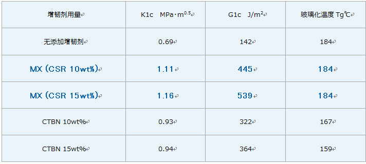 MX可以在不影响环氧树脂原有耐热性(不降低玻璃化温度Tg)的情况下,大幅度提高断裂韧性。